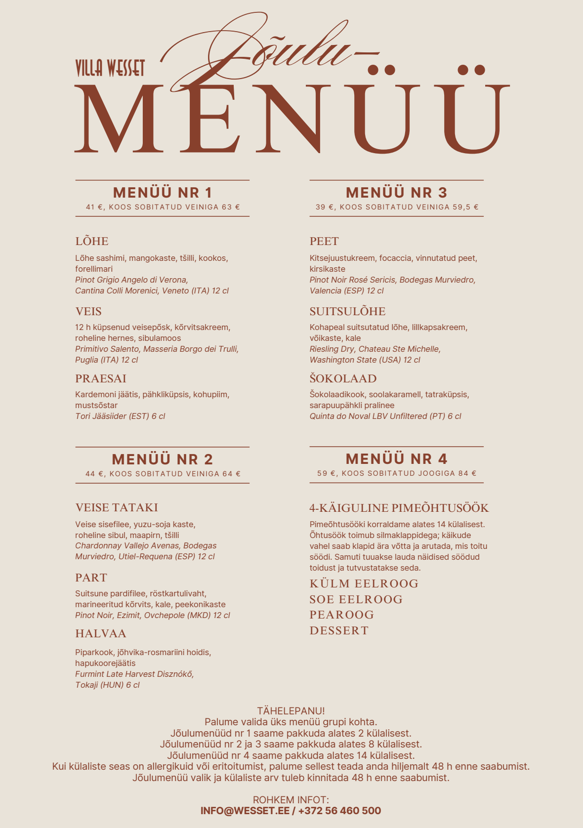 Kui soovid uut aastat alustada hetkedega, mis on täis naudinguid, head muusikat ja elegantset peomeeleolu, siis Villa Wesseti aastavahetus on loodud just sulle. Meie peakoka loodud 6-käiguline pidulik õhtusöök, hoolikalt valitud joogid ja live-muusika loovad unustamatu õhtu – luksuslikult, kuid loomulikus ja mõnusas võtmes.
